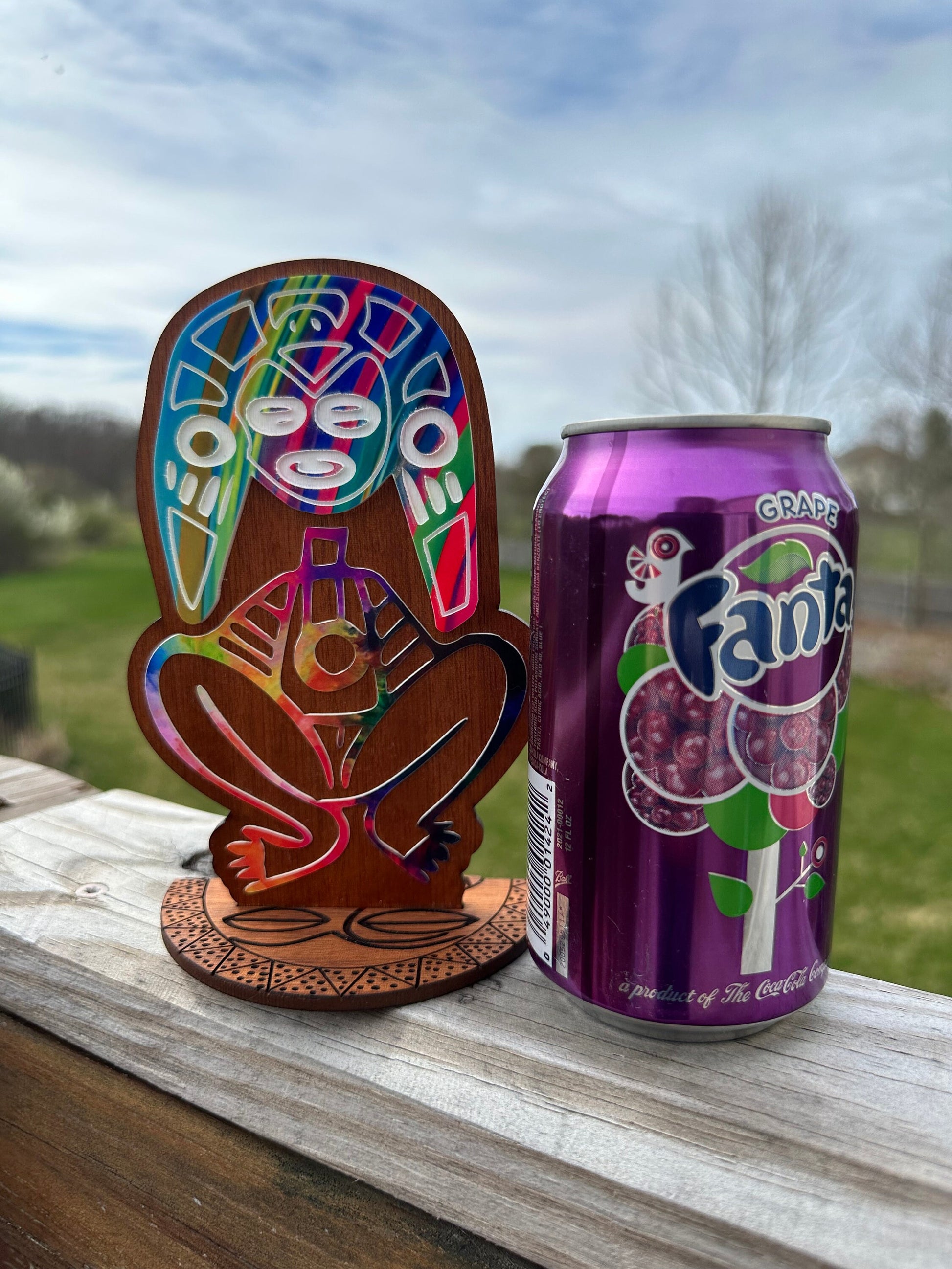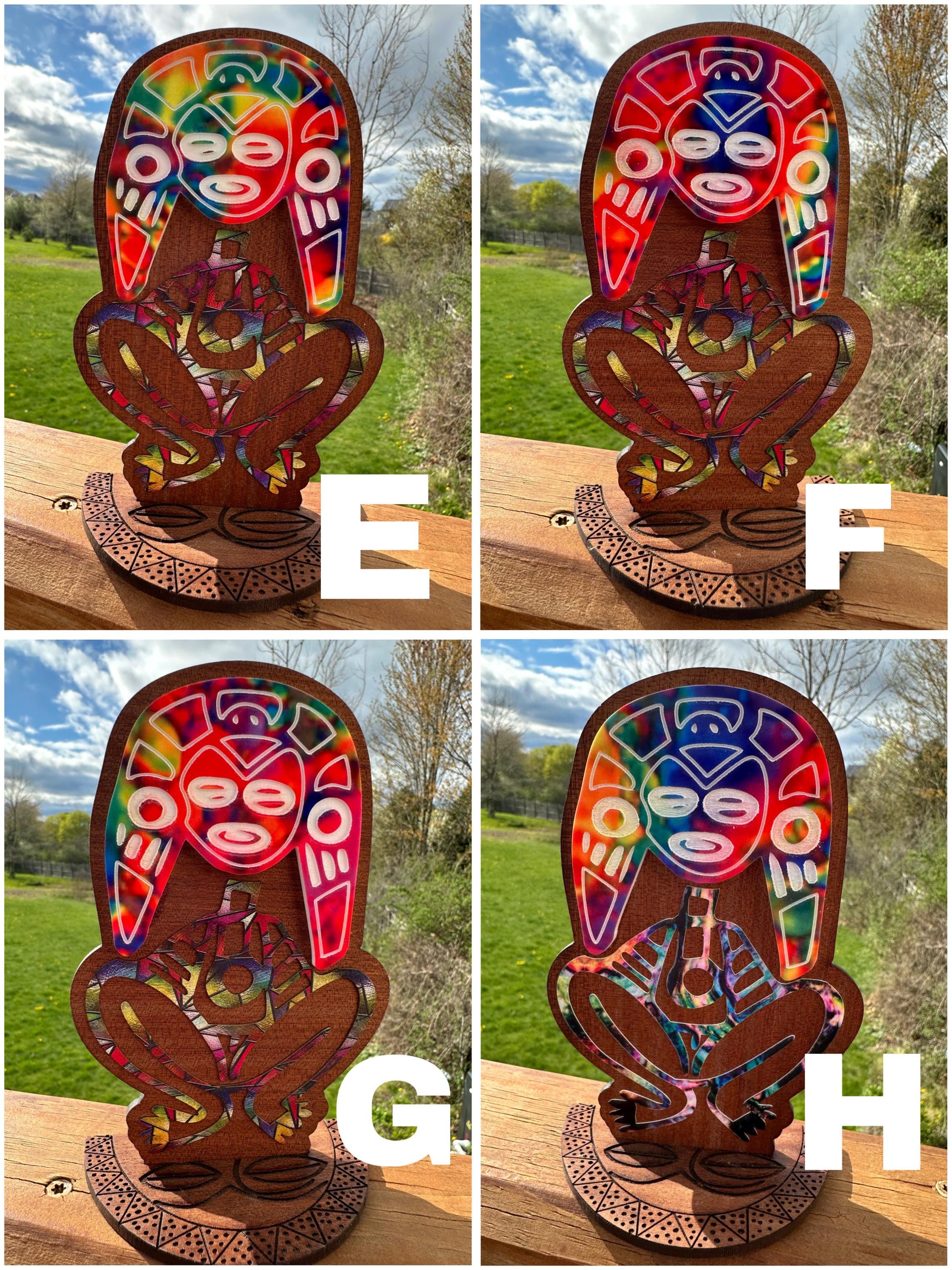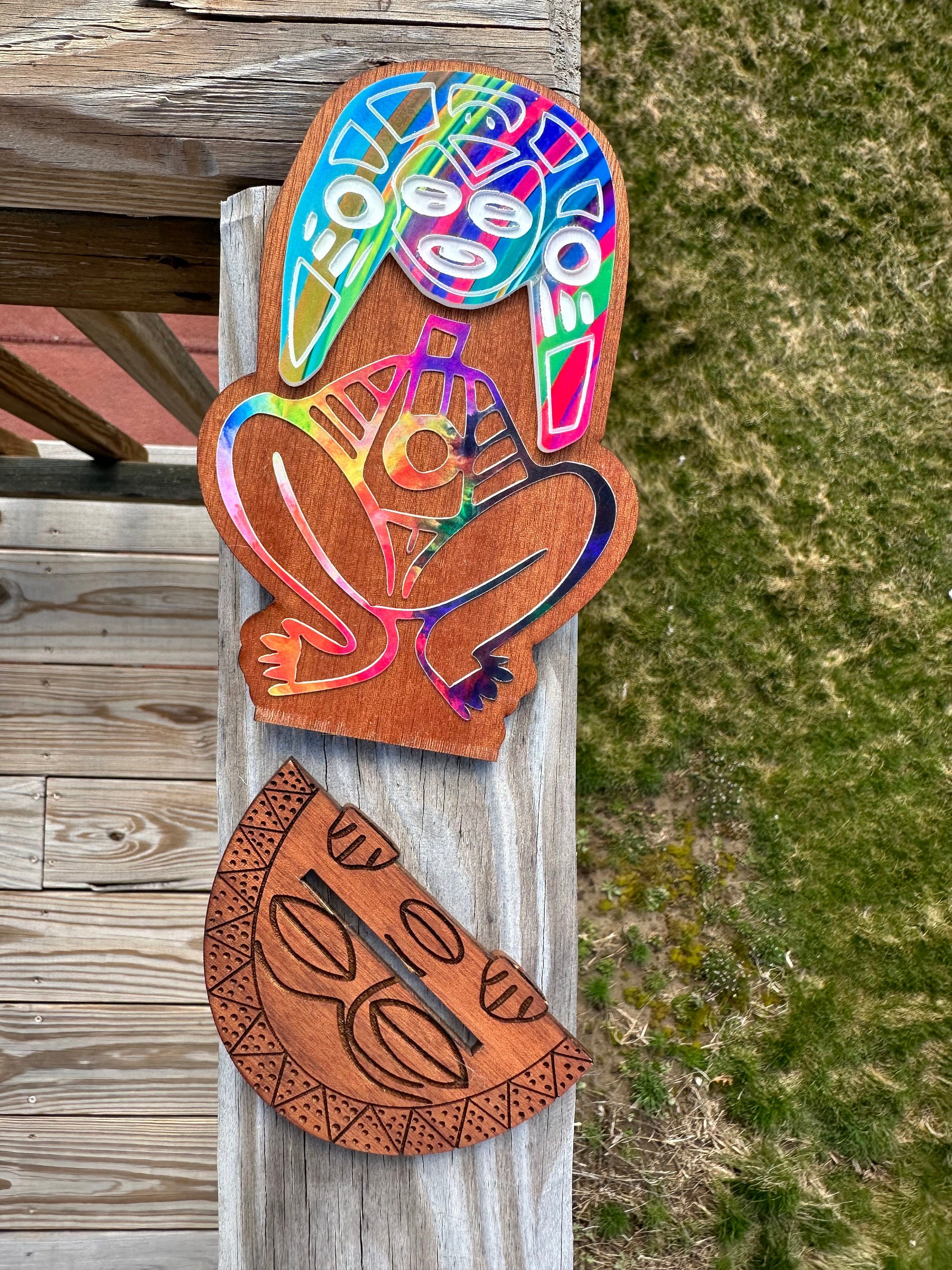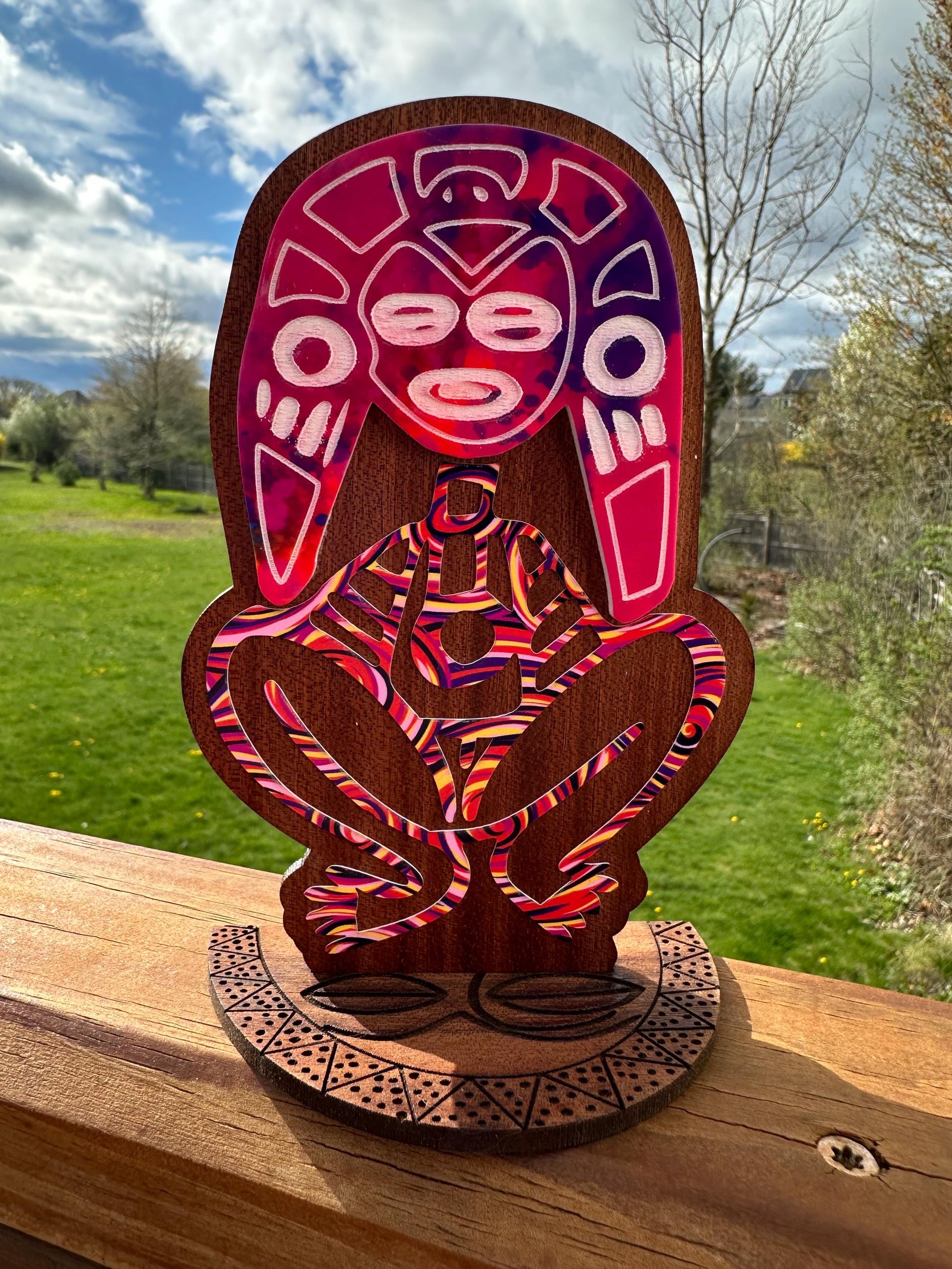 This unique wooden statue captures the essence of Atabey, the supreme goddess of the Taino people, revered as the mother of water and the moon. Atabey is depicted sitting gracefully on a meticulously carved base featuring the image of the Taino moon goddess, symbolizing her connection to the cycles of the moon and her role as a protector of childbirth and fertility. The statue is crafted from rich, durable wood, with Atabey’s face vividly engraved in colorful acrylic, bringing a modern touch to this ancestral figure. Her body is adorned with a vibrant veneer that highlights traditional Taino symbols, imbuing the piece with cultural significance and spiritual power. The inclusion of the moon goddess on the base serves as a homage to the Taino belief in the dual aspects of Atabey as both the mother of waters and the lunar deity, emphasizing her importance in Taino mythology and her influence over the natural world. This statue not only serves as a stunning piece of art but also as a profound tribute to the spiritual and cultural heritage of the Taino people.