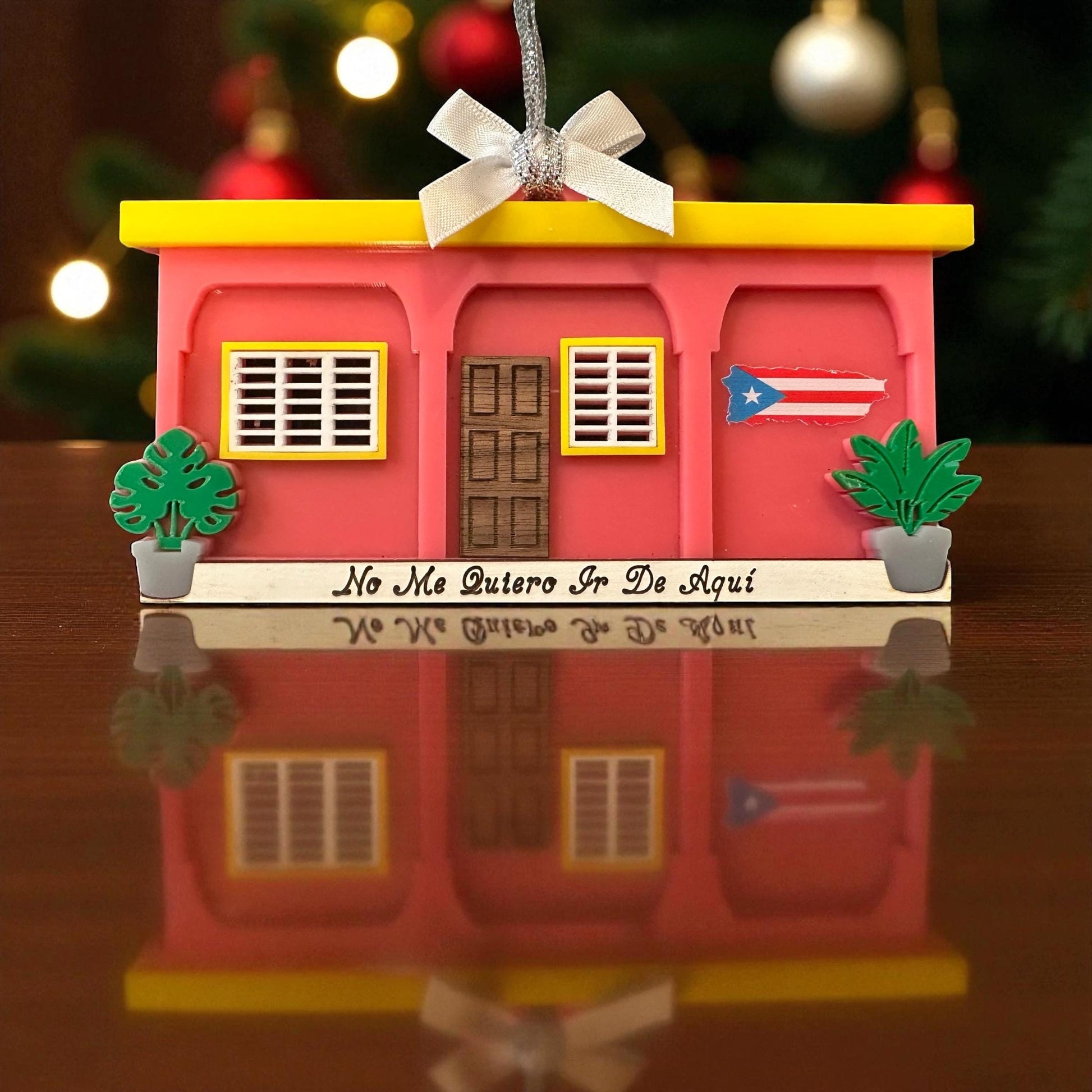 Crafted in bold layers of acrylic and wood, this mini casita features its signature bright pink walls, sunny yellow roofline, classic island-style windows, and a detailed wooden front door. A small Puerto Rican flag rests on the right side, honoring the energy and orgullo that filled the stadium. Two tropical plants frame the doorway, giving it that warm, welcoming vibe every Boricua recognizes.