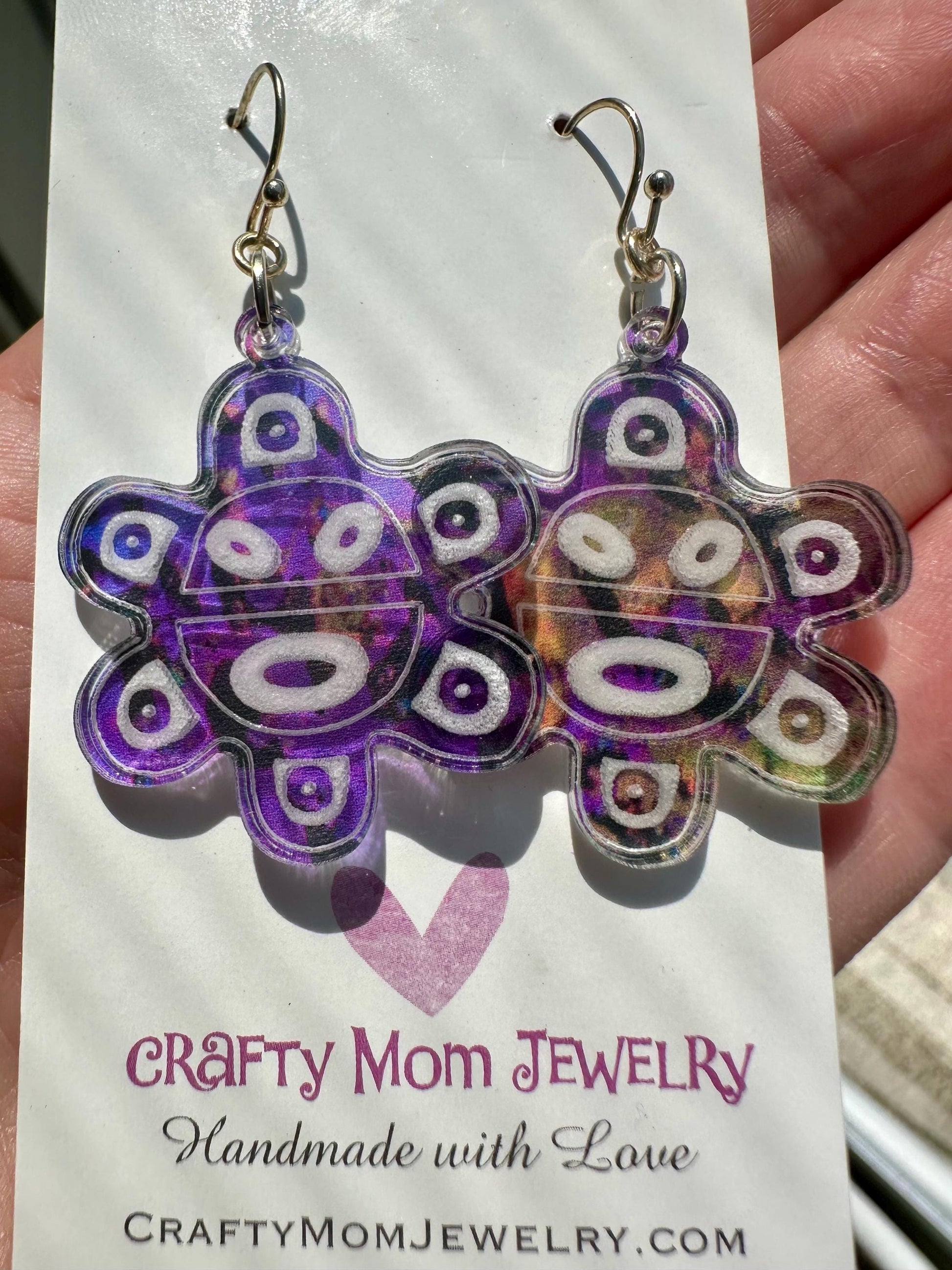 These earrings in the shape of the ancient Taino symbol for the sun. This is a popular symbol in Puerto Rican culture. I have made these on a printed acrylic, so no two pairs are alike. You will be the only one to wear exactly the pair you choose. I hope they bring some sunshine into your life.