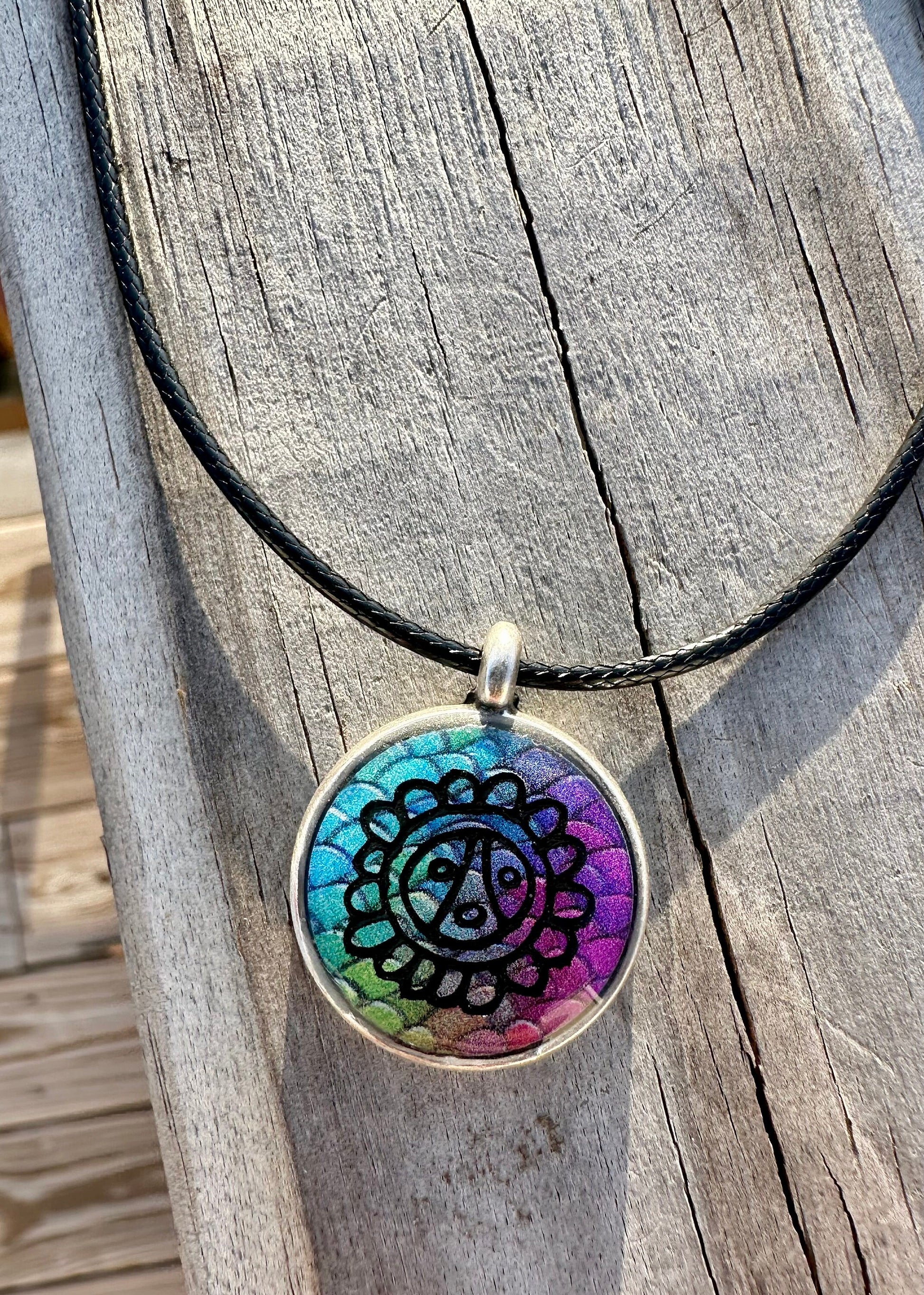 This exquisite pendant necklace celebrates the rich cultural heritage of Puerto Rico through its enchanting design, featuring iconic Taíno symbols—the coqui frog, the hibiscus flower, and the sol de Utuado. Each symbol is intricately carved into vibrant, colorful acrylic, showcasing the unique blend of natural beauty and historical significance these emblems hold. Mounted in a sleek metal pendant base, the artwork is encapsulated under a glossy layer of resin, which not only enhances the colors but also provides a durable finish that protects and preserves the intricate details of the design.