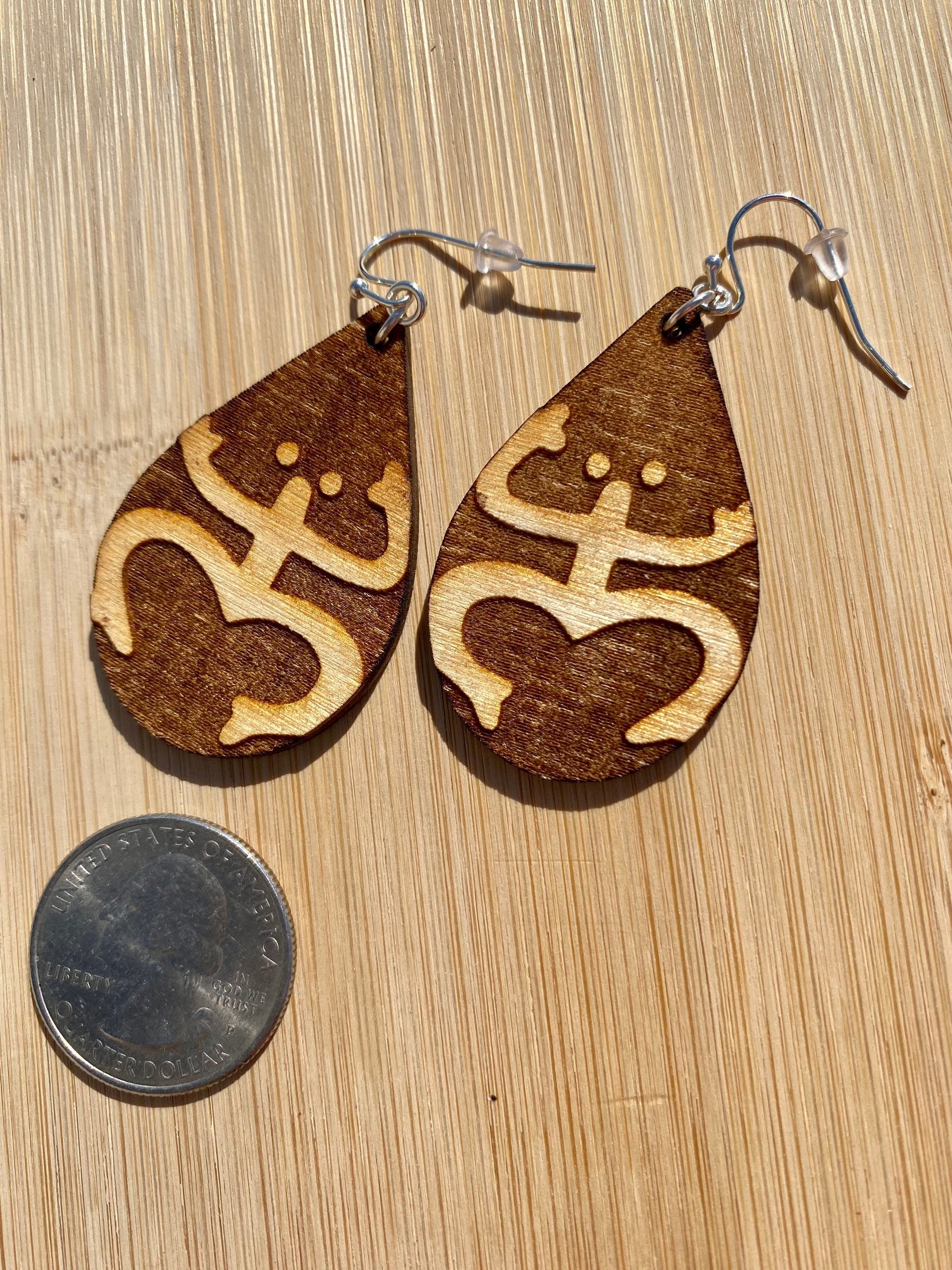 These earrings are engraved on birch wood and depict a Coqui Taino symbol. They are stained a dark wood color on the back and are natural color on the symbol. The darker contrast is the engraved wood.