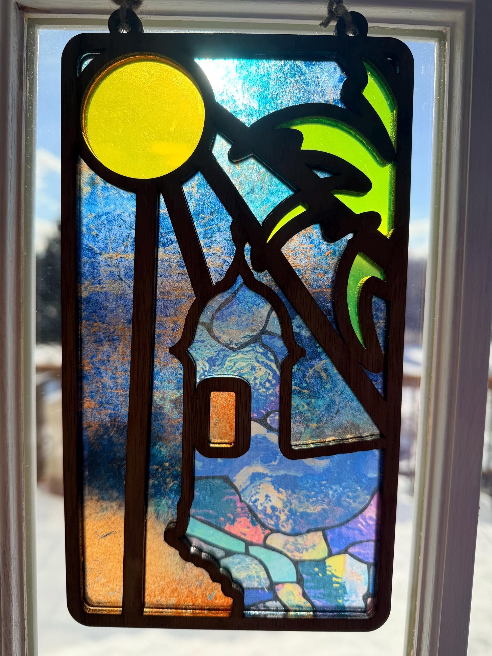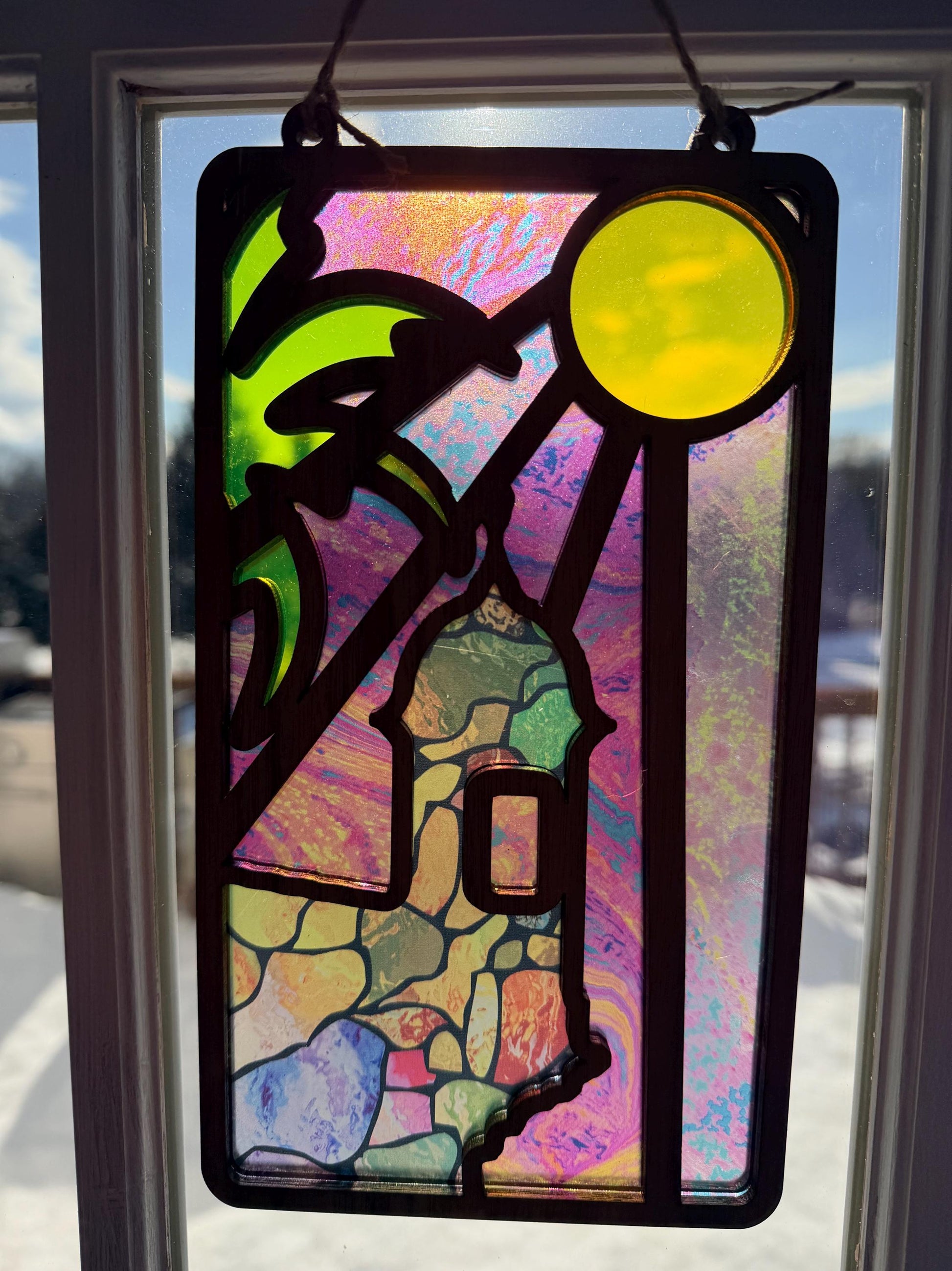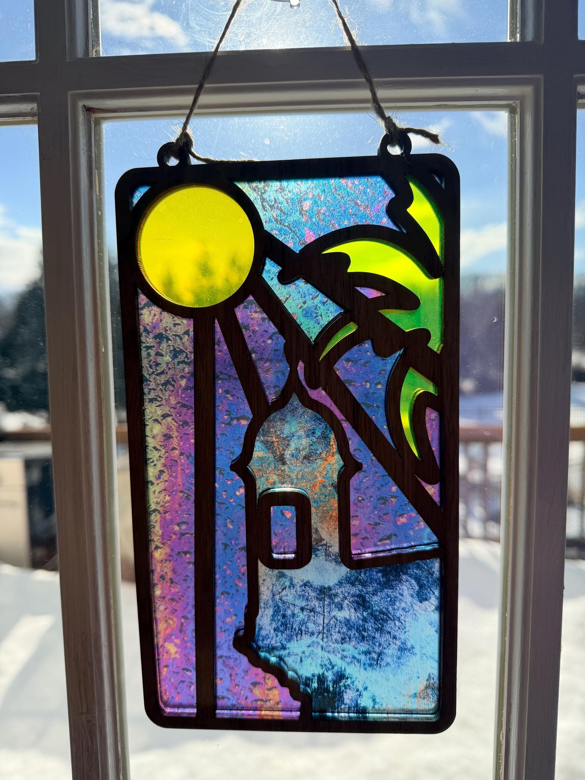 Because of the unique acrylic patterns and natural wood grain, no two pieces are ever exactly alike. Each suncatcher carries its own movement of color, making your piece truly one of a kind.