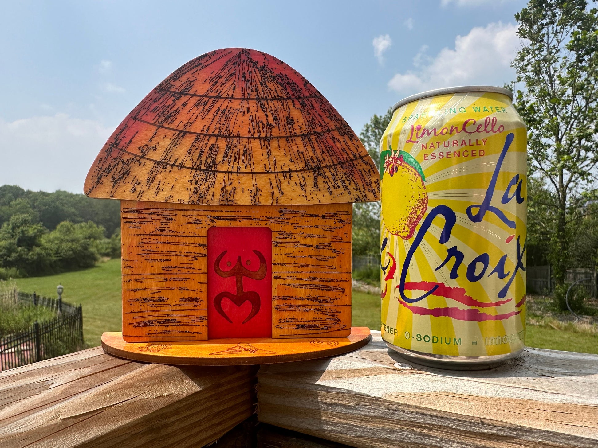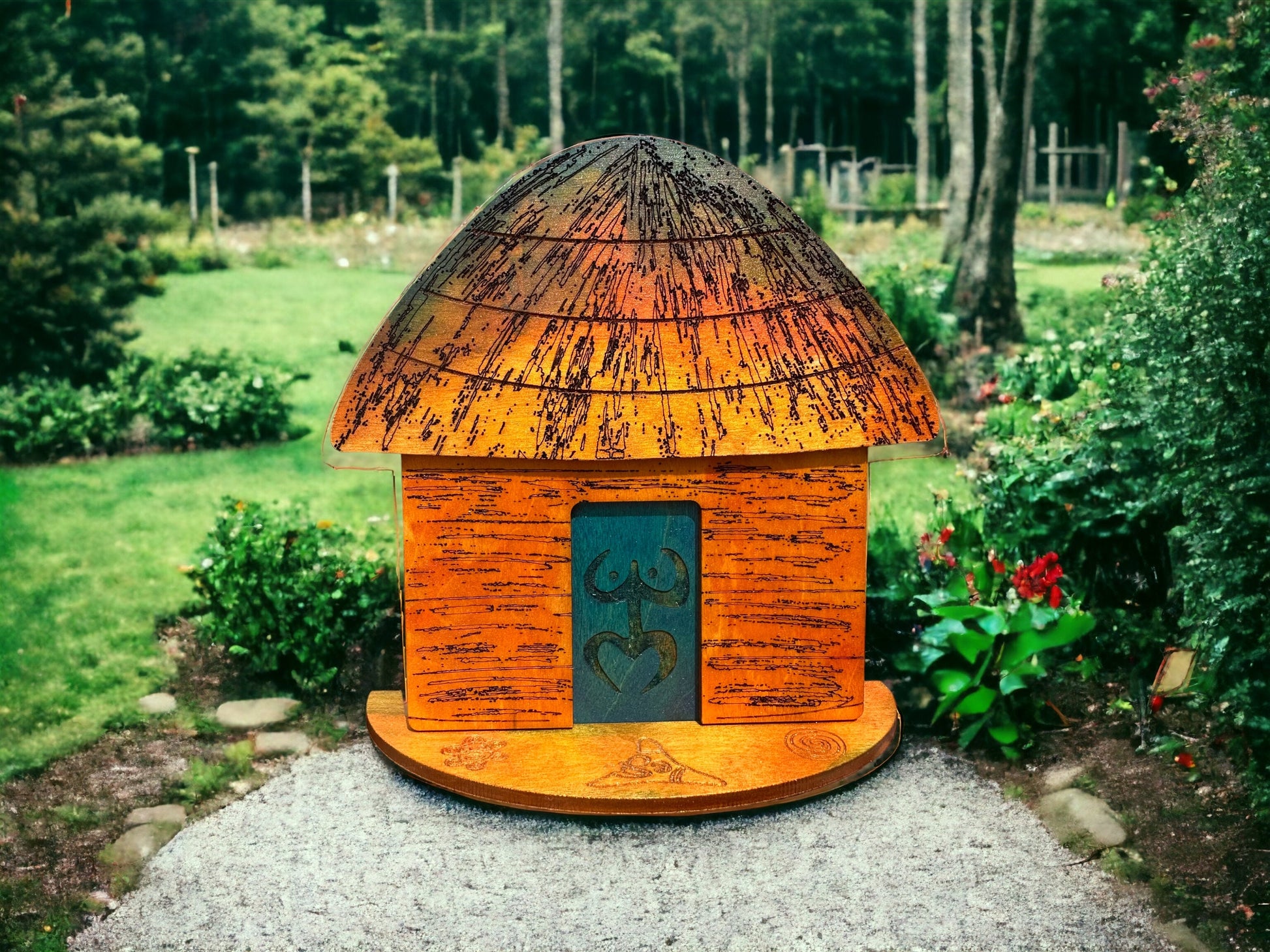 This particular bohío art piece features a combination of engravings and hand-painted elements, creating a visually stunning and intricate design. The main structure sits atop a wooden base, providing stability and enhancing the overall aesthetic appeal.