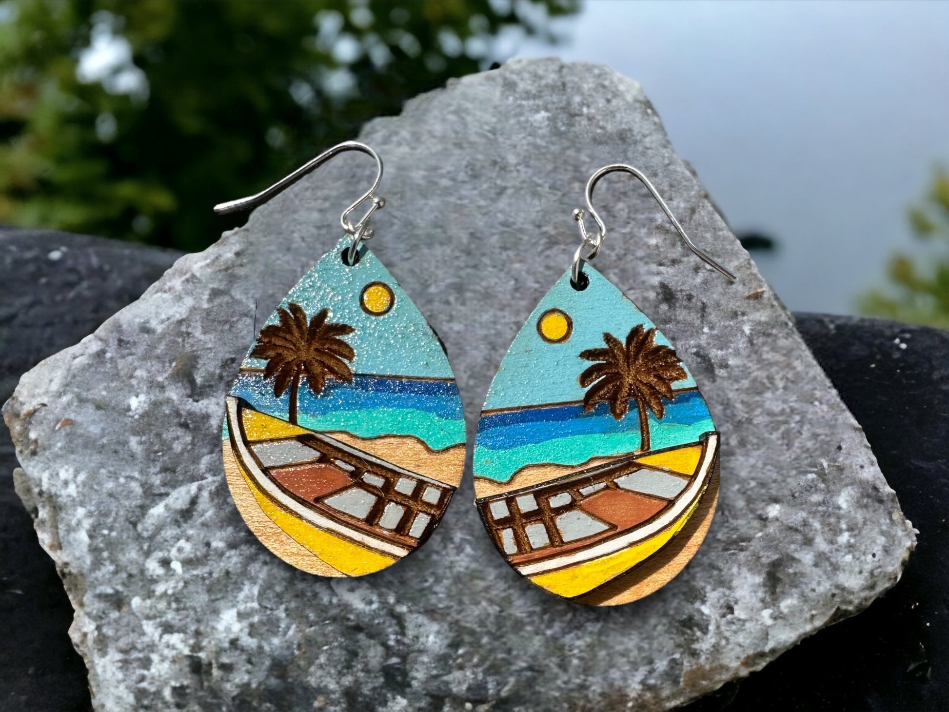 Hand-Painted Yola Earrings: Puerto Rican Beach Scene, Crashboat beach, Hypoallergenic fishing boat Dangles
