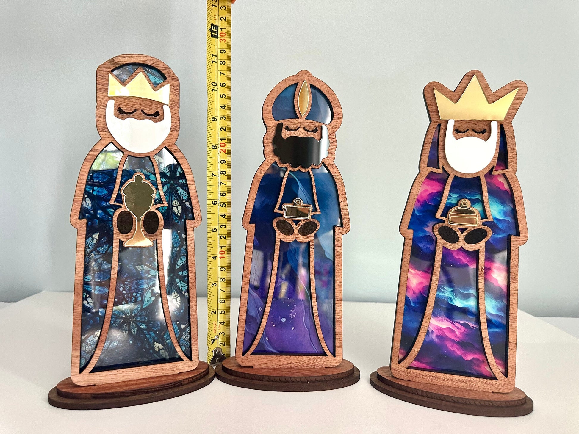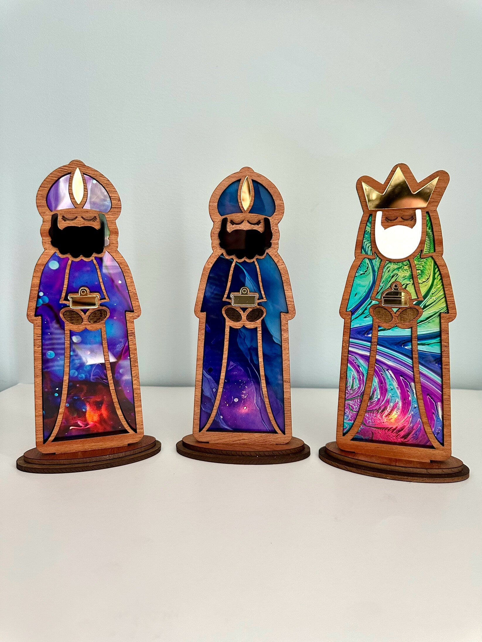 Introducing our exquisite handmade wooden Three Kings set, a captivating piece that combines tradition and artistry. Each figure stands approximately 10.5 inches tall, crafted with a transparency that gives their robes a stunning stained glass look. Mounted on a wooden base, these figures are designed to hold battery-operated candles behind them, creating a mesmerizing display of flickering light that brings the colors to life.