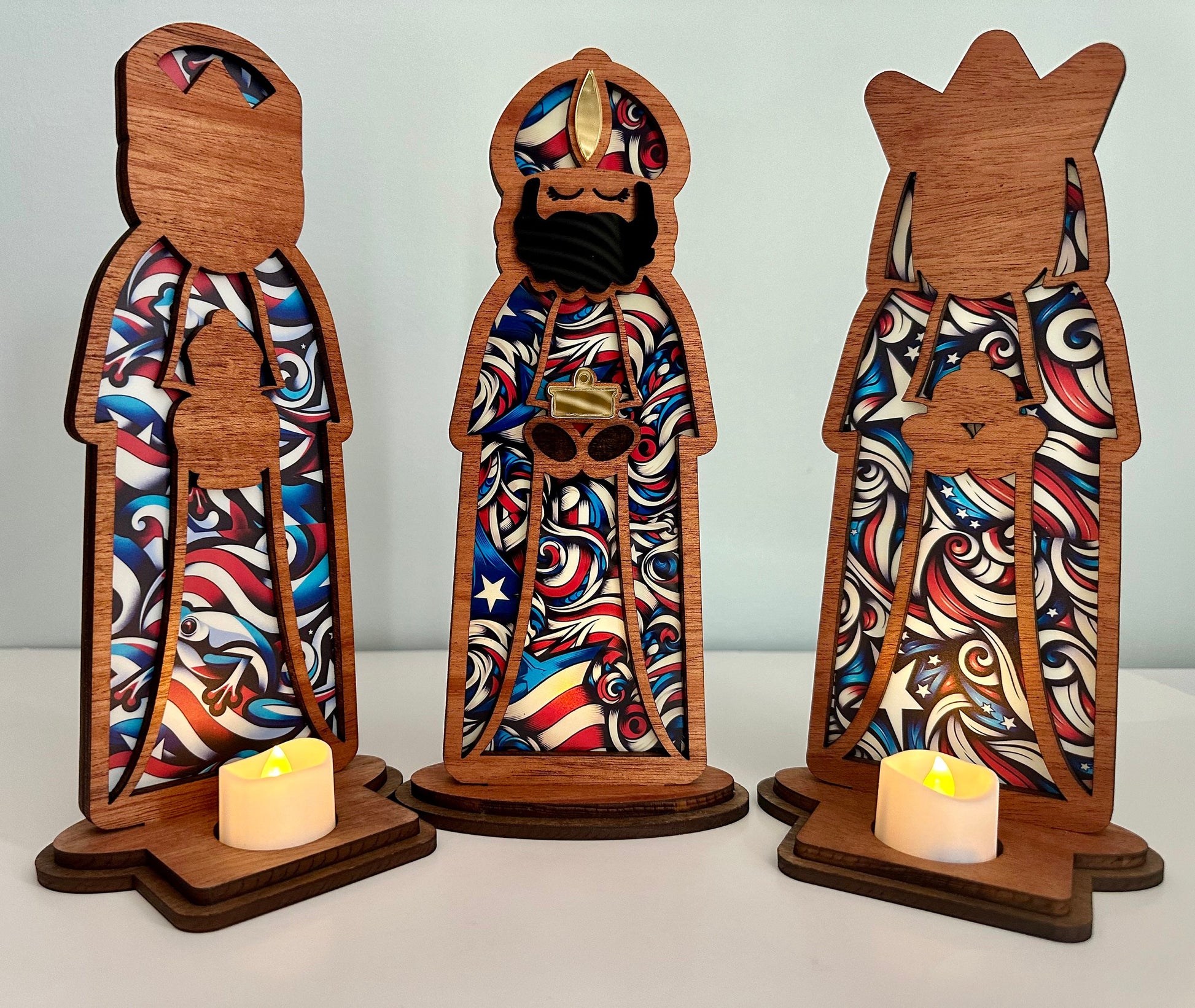 Handmade Three Kings Wooden Figures large: Stained Glass Look Candle Holders, Puerto Rico art