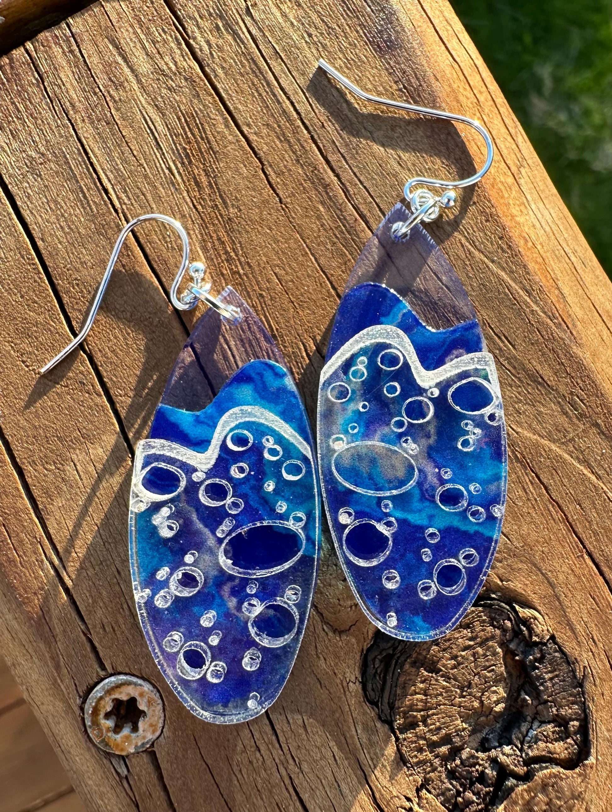 Ride the wave with these ocean-inspired surfboard earrings, designed to capture the magic of the sea. Each piece features layered ocean blues, bringing depth and movement to the design. The top layer is crafted from shimmering acrylic adorned with holographic stars, like starlight dancing on midnight waves. Delicate engraving at the crest mimics the frothy white foam of breaking surf, adding texture and motion.