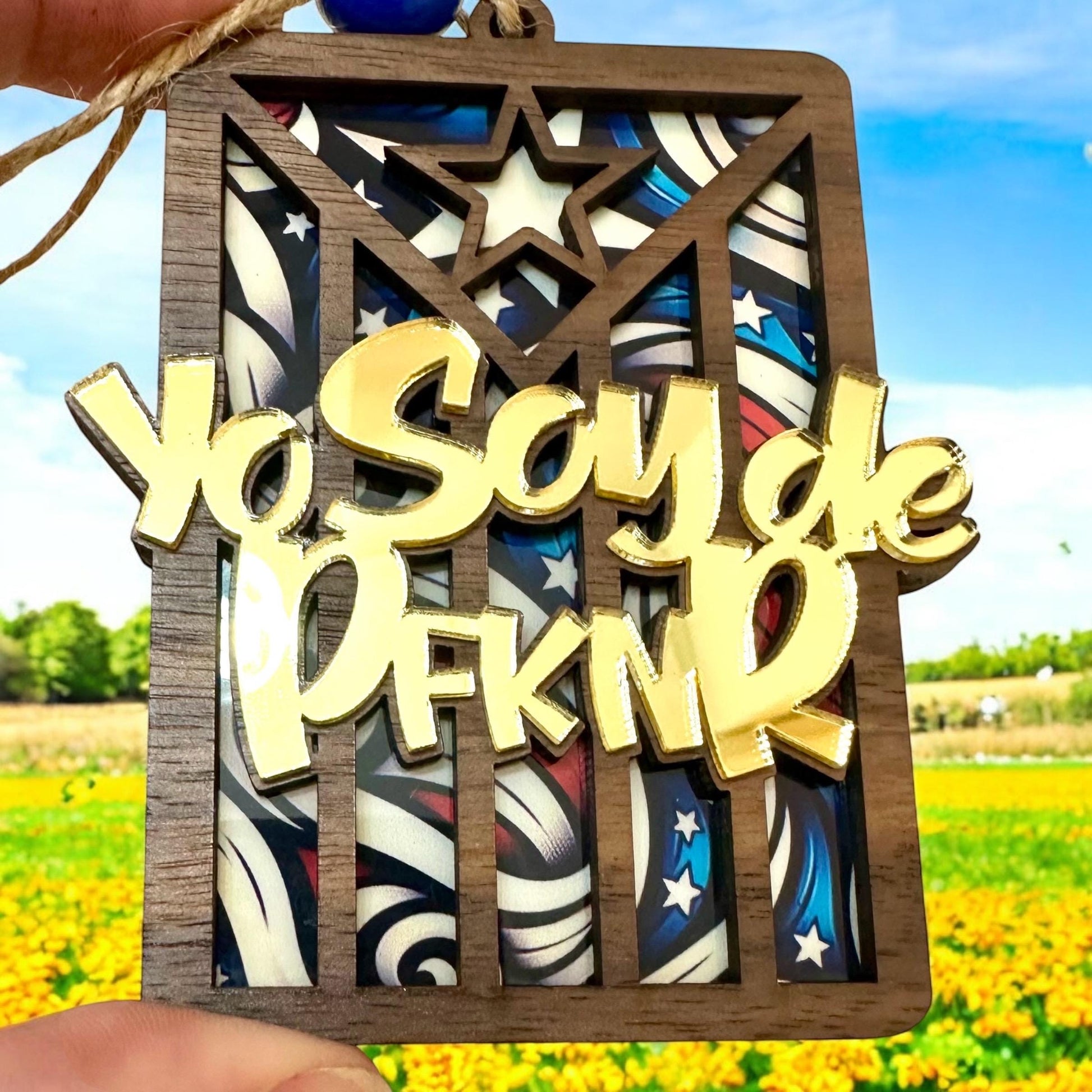 This bold and beautiful piece is more than a car charm—it’s a declaration. Made from two layers of rich walnut wood, it features a vibrant transparency of the swirling Puerto Rican flag colors, captured between the layers like a flame that never dies. Across the front, the words “Yo soy de PfknR” are cut from radiant gold mirror acrylic, catching the light just right to make a statement.