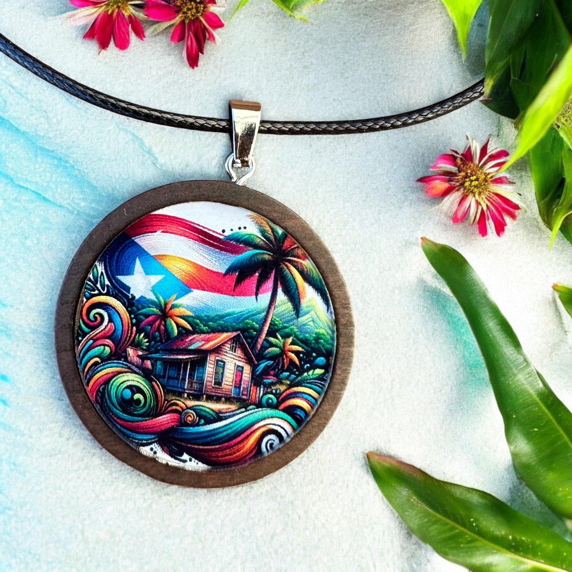 Introducing a beautiful custom-printed necklace that celebrates the heart and soul of Puerto Rico! This unique piece features a vibrant image of the Puerto Rican flag proudly flying over a traditional *casita* in the *campo* (countryside), symbolizing the deep connection to home and heritage. The image is printed on durable acrylic and mounted in a finely crafted wooden pendant, adding warmth and texture to the design. The pendant hangs from a natural linen cord, adjustable between 18 and 20 inches for the perfect fit. Available in two pendant sizes—approximately 1.15 inches and 1.35 inches—this necklace is a stylish and meaningful way to wear your Puerto Rican pride.