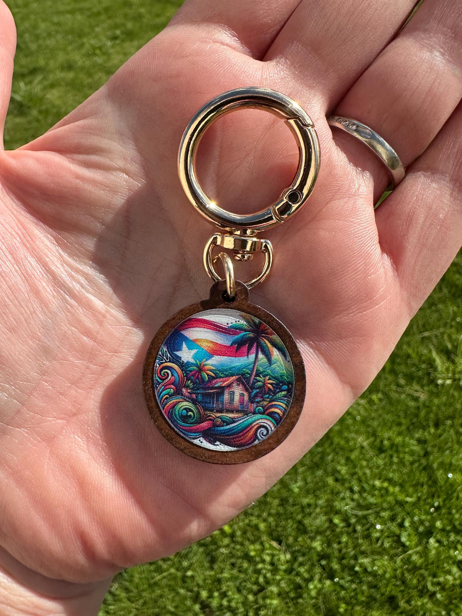 Introducing a beautiful custom-printed keychain that celebrates the heart and soul of Puerto Rico! This unique piece features a vibrant image of the Puerto Rican flag proudly flying over a traditional *casita* in the *campo* (countryside), symbolizing the deep connection to home and heritage. The image is printed on durable acrylic and mounted in a finely crafted wooden keychain, adding warmth and texture to the design. This keychain is a stylish and meaningful way to show your Puerto Rican pride.