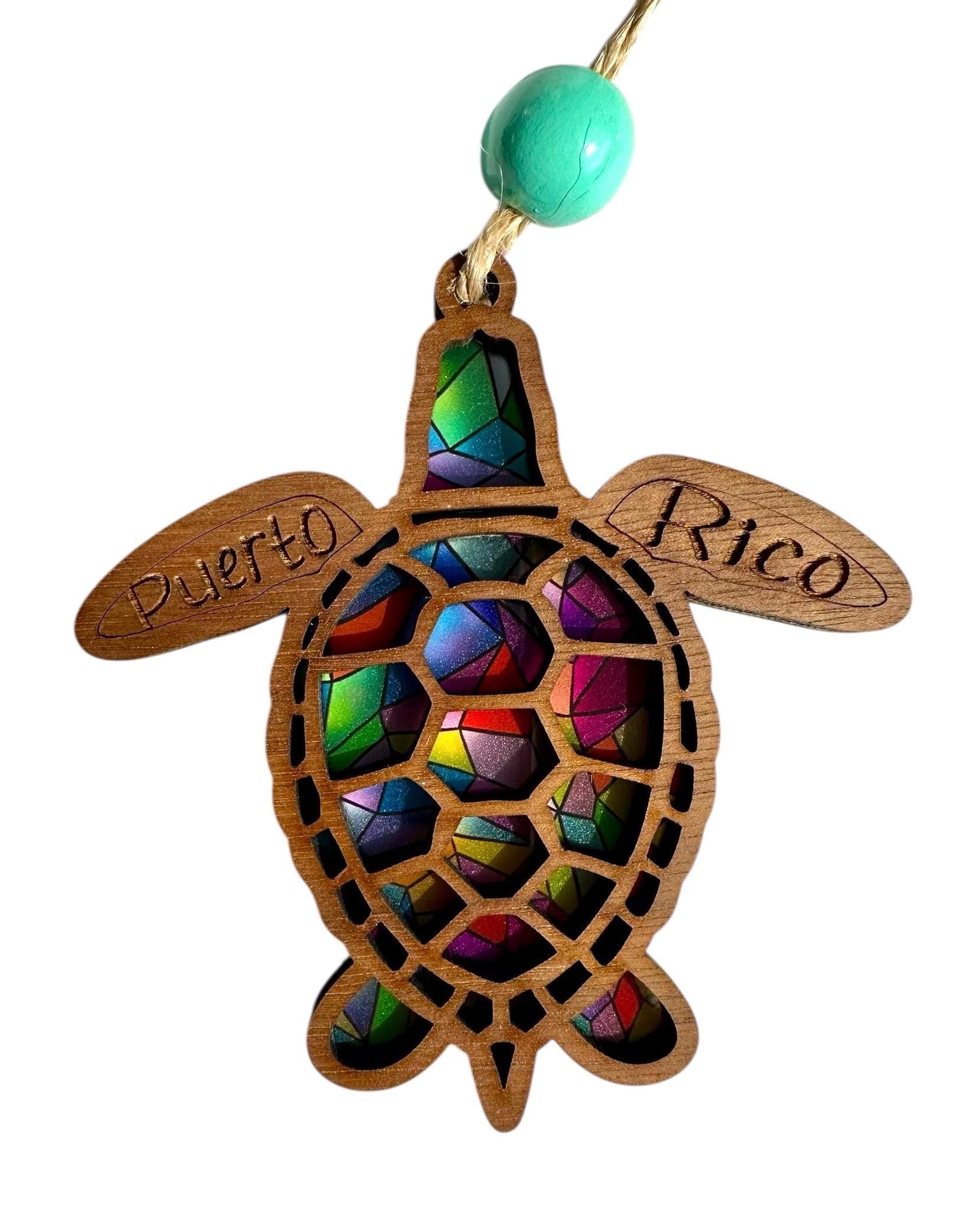 Puerto Rico Sea Turtle Suncatcher: Stained Glass Style Wood Car Charm and ornament
