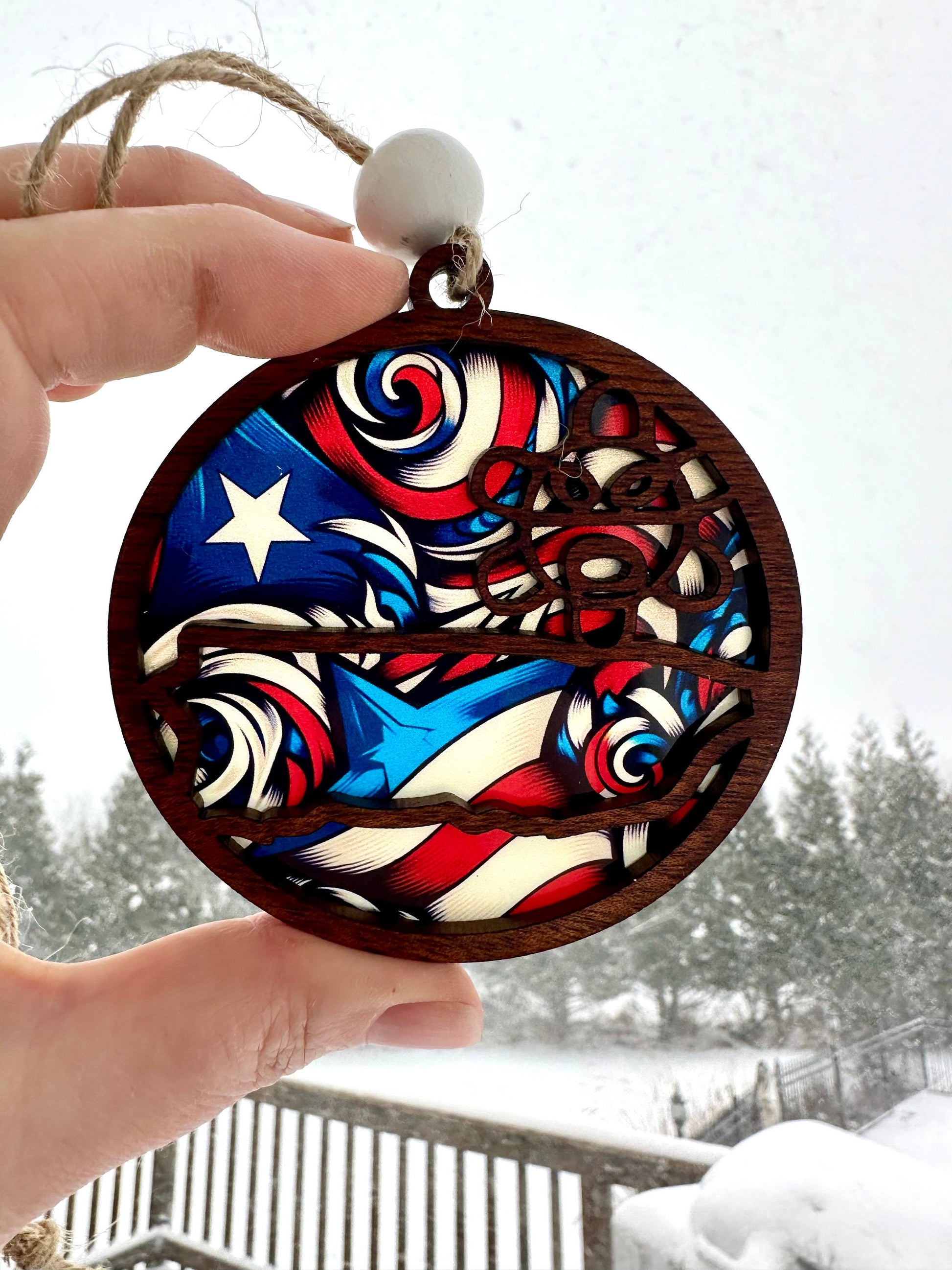 This unique car charm is masterfully crafted from either mahogany or sapele wood, featuring the distinctive outline of the island of Puerto Rico. Above the island, a Taino Sun symbol radiates warmth and heritage. Between the layers of wood, a custom-designed transparency showcases an artistic interpretation of the Puerto Rican flag, allowing light to filter through with a vibrant display. This versatile piece can also be gracefully used as a suncatcher or a festive holiday ornament. Each charm is one-of-a-kind, with variations in the placement of the transparency and the color of the bead, adding to its unique character and charm.