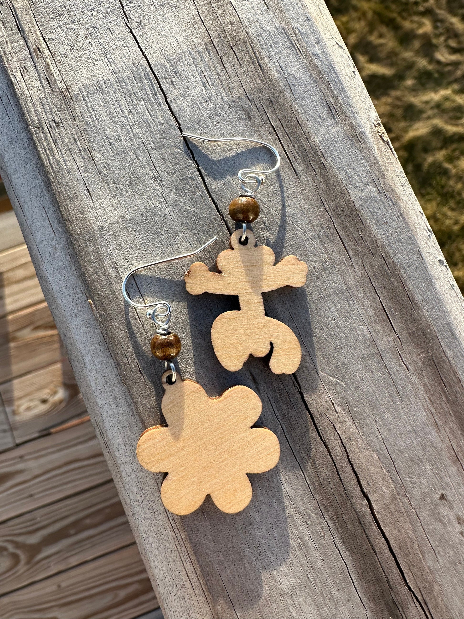 Each earring is thoughtfully finished with a small, polished wooden bead, adding an elegant touch of natural beauty that complements the detailed engravings. The earrings dangle gracefully, designed to catch the light and draw attention to the delicate artistry and meaningful symbols they bear.