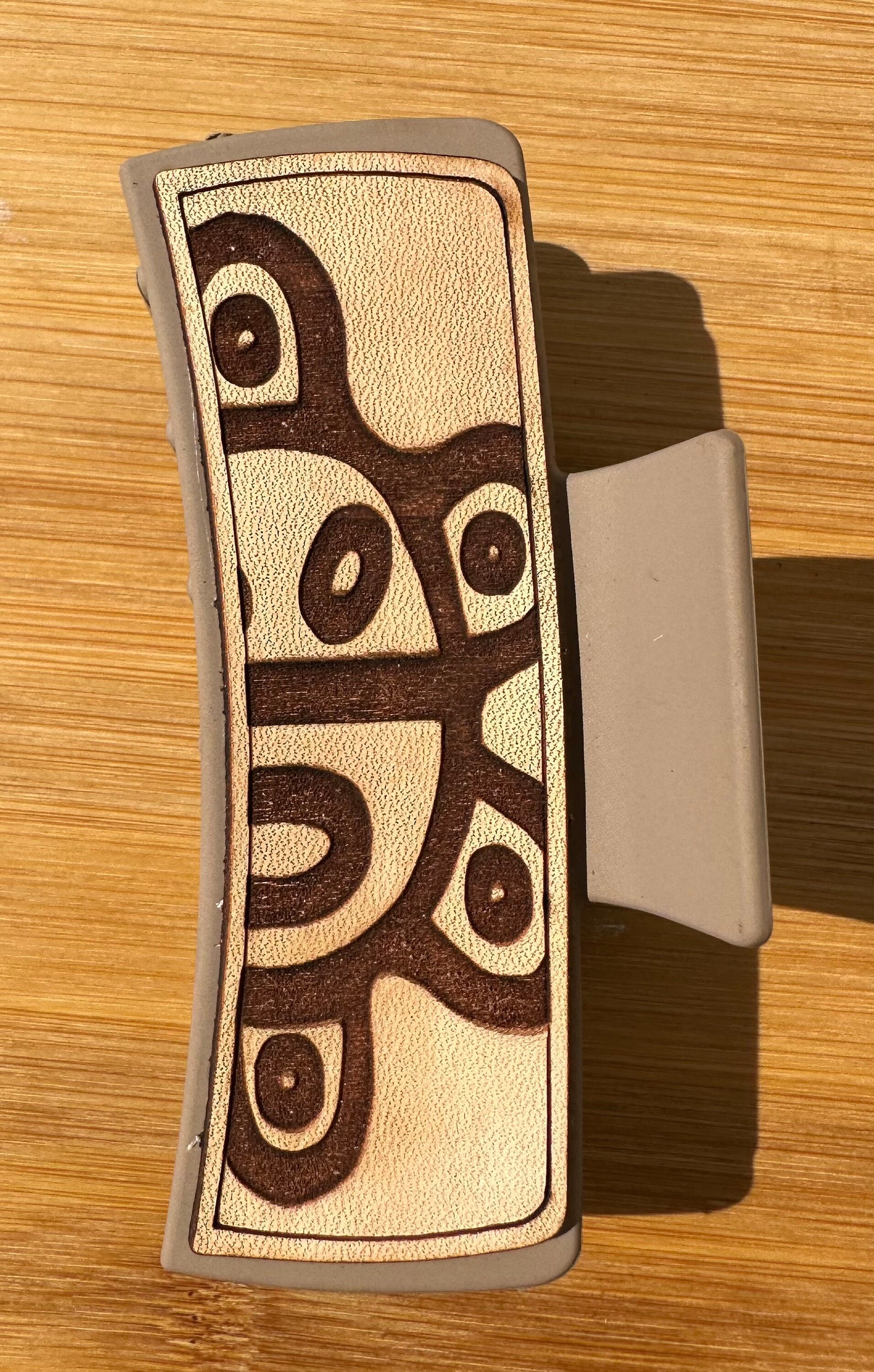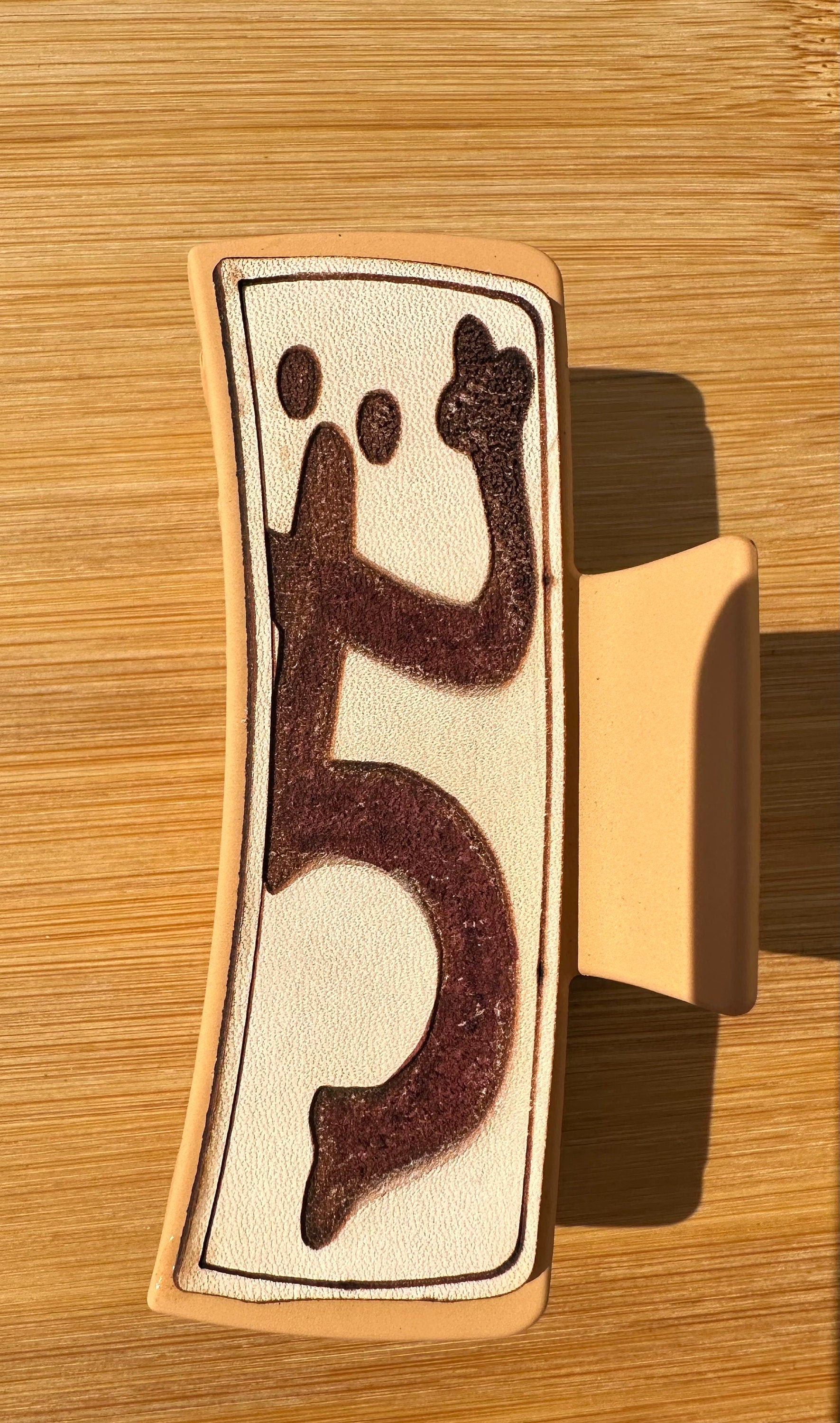 This hair claw clip features the Taino symbols for the coqui and sun, intricately engraved on high-quality leather. The leather piece is securely affixed to a durable, heavy-duty plastic clip, ensuring both style and functionality. The natural variations in the leather make each clip a one-of-a-kind accessory, reflecting the authenticity and craftsmanship behind every piece.