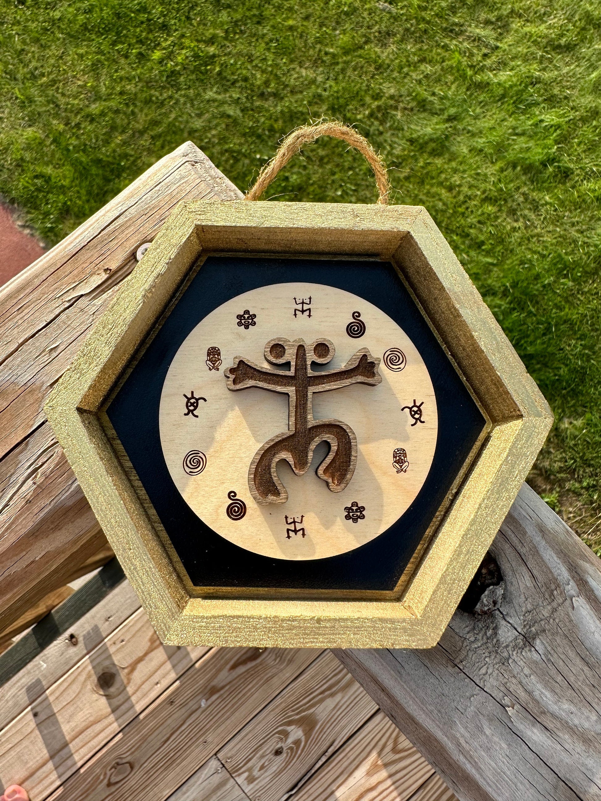 This piece features layers of black, maple and mahogany wood encased in a wooden frame painted a shiny gold. The art features the Taíno symbols for the coqui, sun, water, turtle, snail and Atabey, the goddess of fertility.